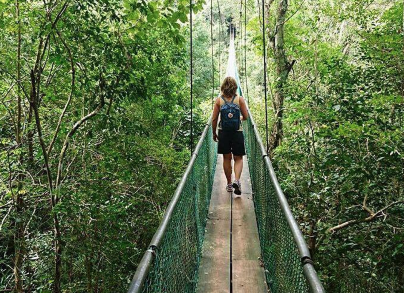 Marche sur les sentiers interprétatifs et ponts suspendus dans la végétation luxuriante. On observe de nombreux oiseaux et des singes araignées. Découverte d’une serre aux papillons.